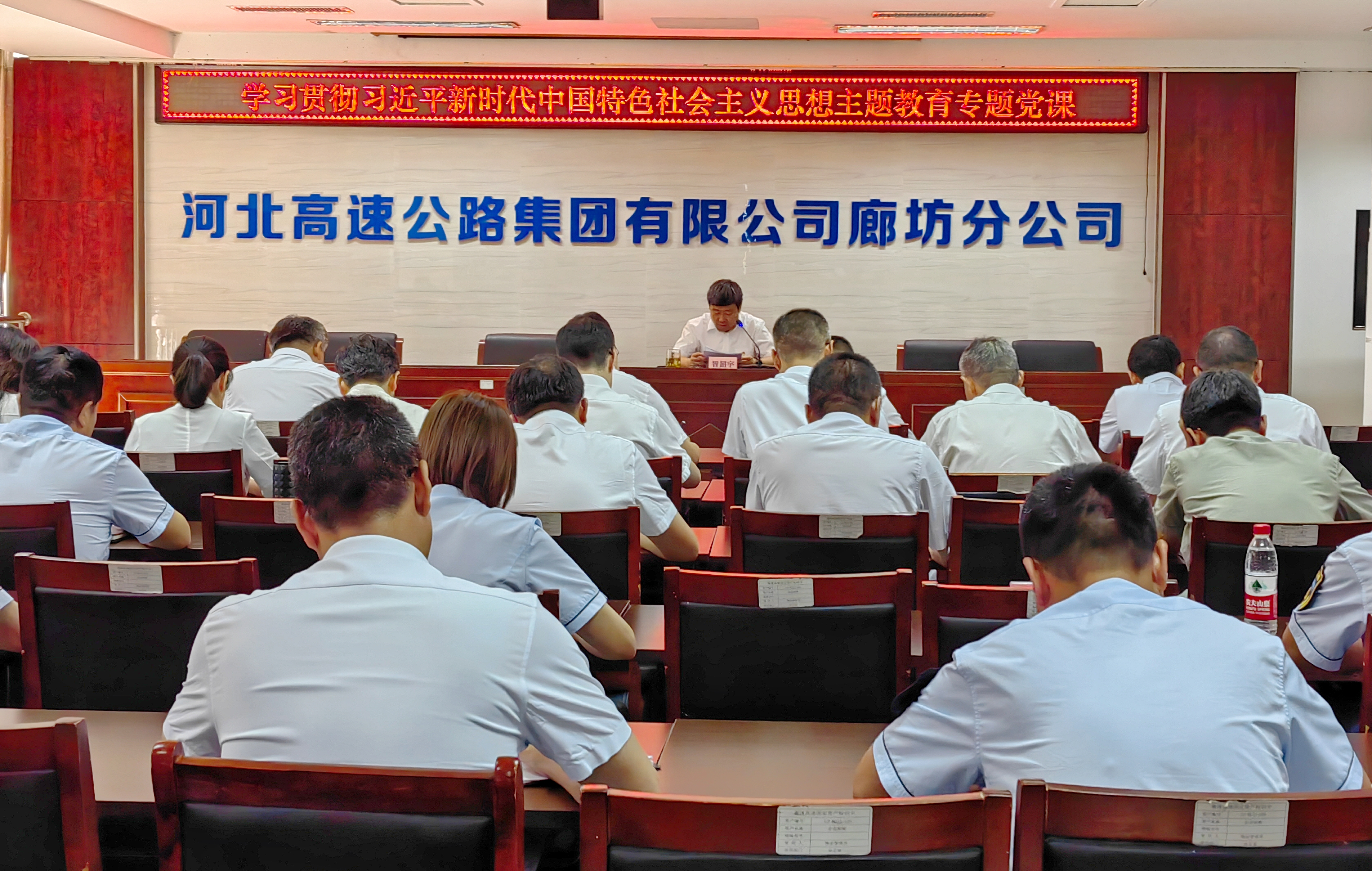 7月6日下午,在认真聆听集团公司党委书记、董事长张建公向广大党员干部讲的主题教育专题党课后,廊坊分公司党委书记、副总经理智韶宇就如何更好贯彻落实建公董事长党课精神进行了动员部署,随后按照分公司党委主题教育专题党课安排,为分公司中层及以上干部讲了一堂主题鲜明、内容详实、析理透彻的高质量党课,教育引导分公司全体党员干部要在理论学习中淬炼坚强党性,在主题实践中提升履职本领,在具体工作中展现担当作为,以“使命在岗位 建功在本职”的精神,发扬传统、埋头苦干,革故鼎新、挑战自我,坚持用新思维、新手段破解发展中的新难题,以各项工作的新起色、新亮点、新成绩为河北高速事业的发展增光添彩。(拍摄者:董雅斯)