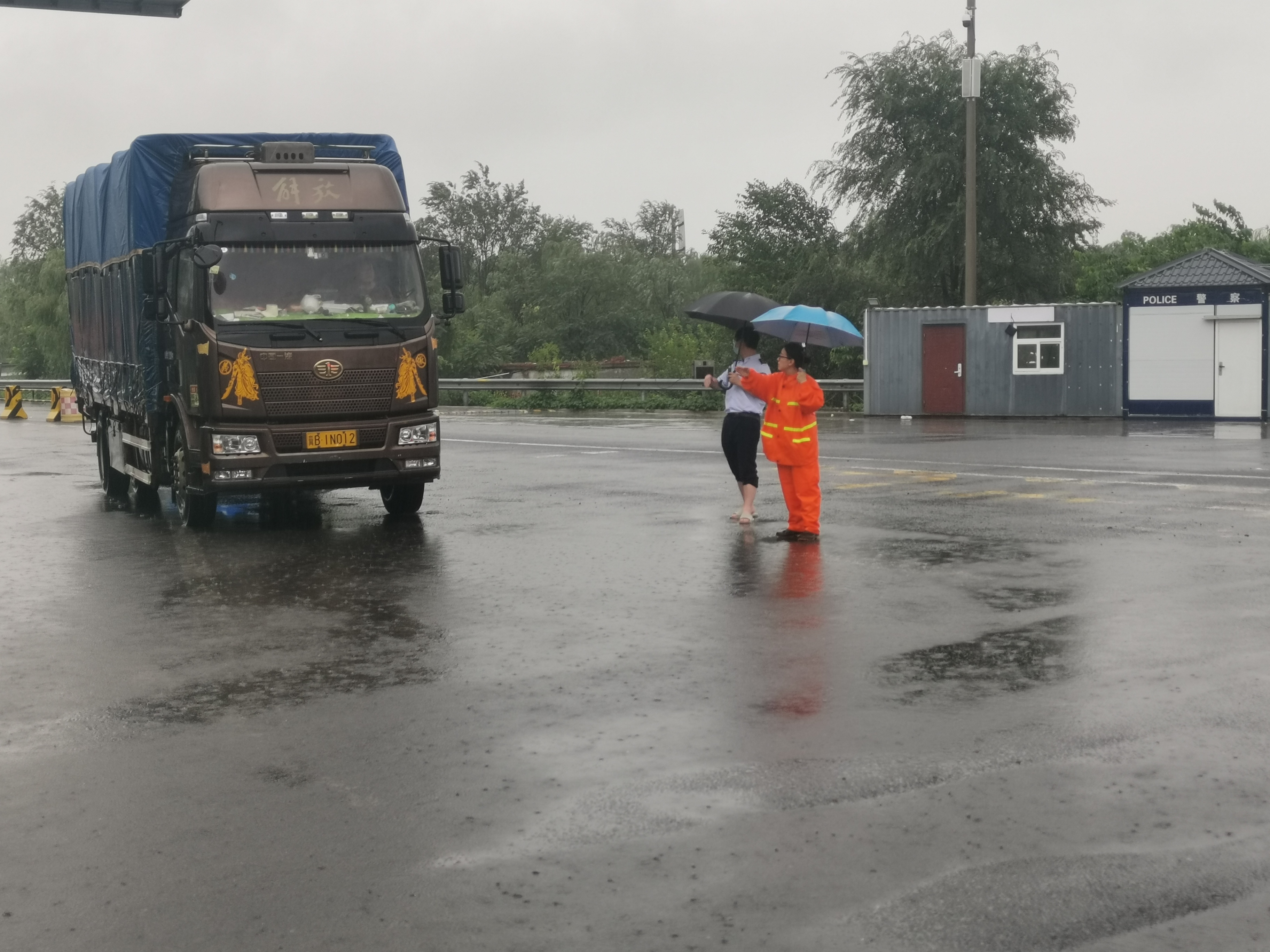 受持续暴雨影响,高官庄收费站计重设备故障,站领导班子组织在岗党员成立防汛保畅先锋队,积极配合收费一线完成过往车辆疏导工作。(摄影:王芳 郑亚敬)