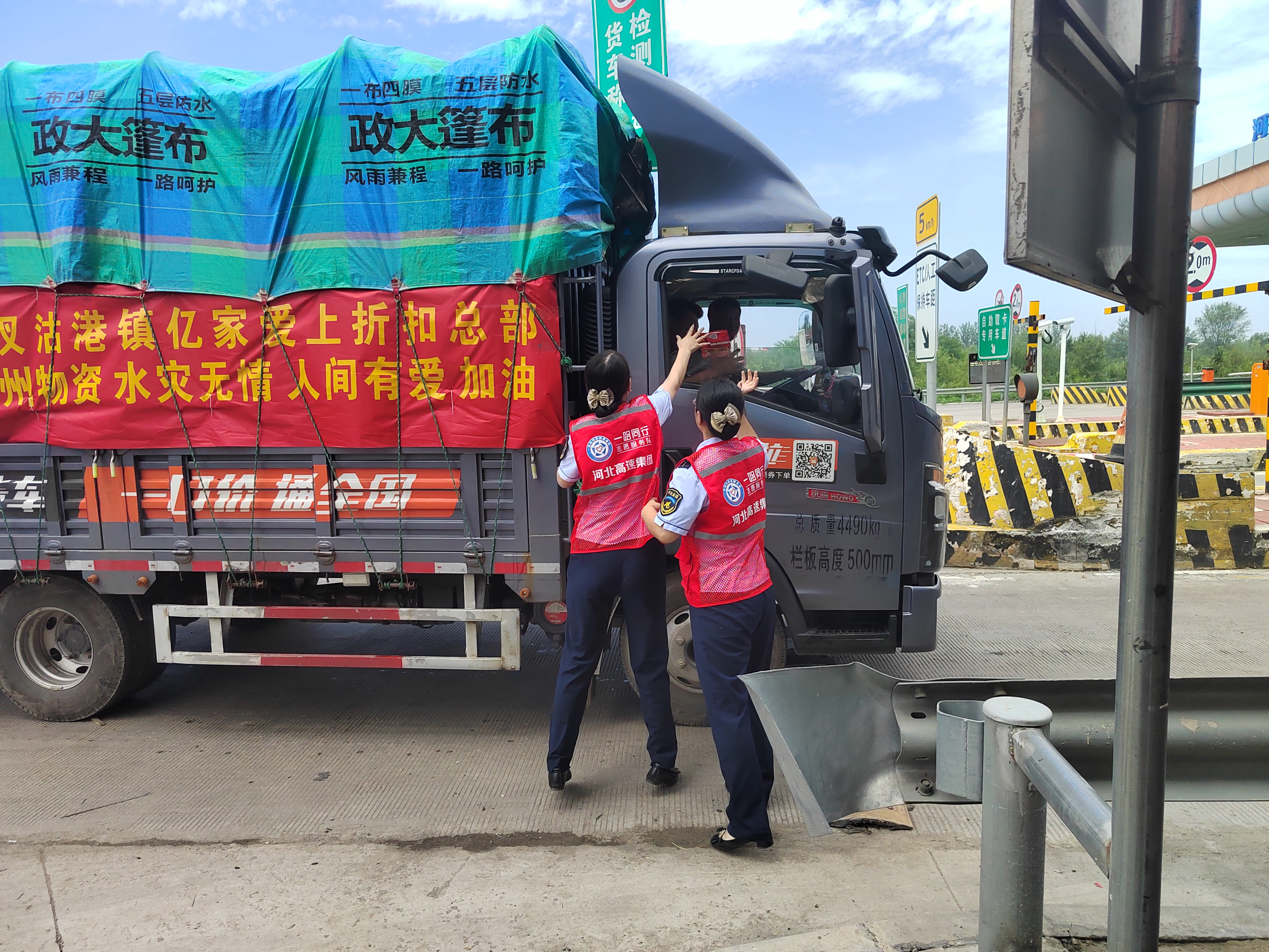 高官庄收费站组建了“一路同行”志愿服务队,在收费站入口位置设立服务台,为返程救援人员免费提供食物、矿泉水和应急药品。(摄影:王芳 郑亚敬)