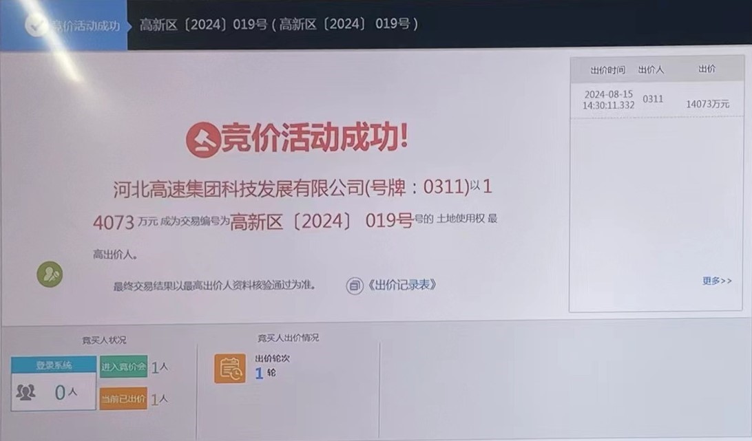 8月15日,河北高速集团资源开发运营有限公司所属河北高速集团科技发展有限公司参加了石家庄高新区〔2024〕019号地块的国有建设用地使用权拍卖出让活动,最终以14073万元的价格成功竞得该地块,代表着河北高速集团电子科技产业园项目的实施迈出坚实一步。竞拍成功后,公司负责人现场与石家庄市自然资源和规划局签订了土地成交确认书。
