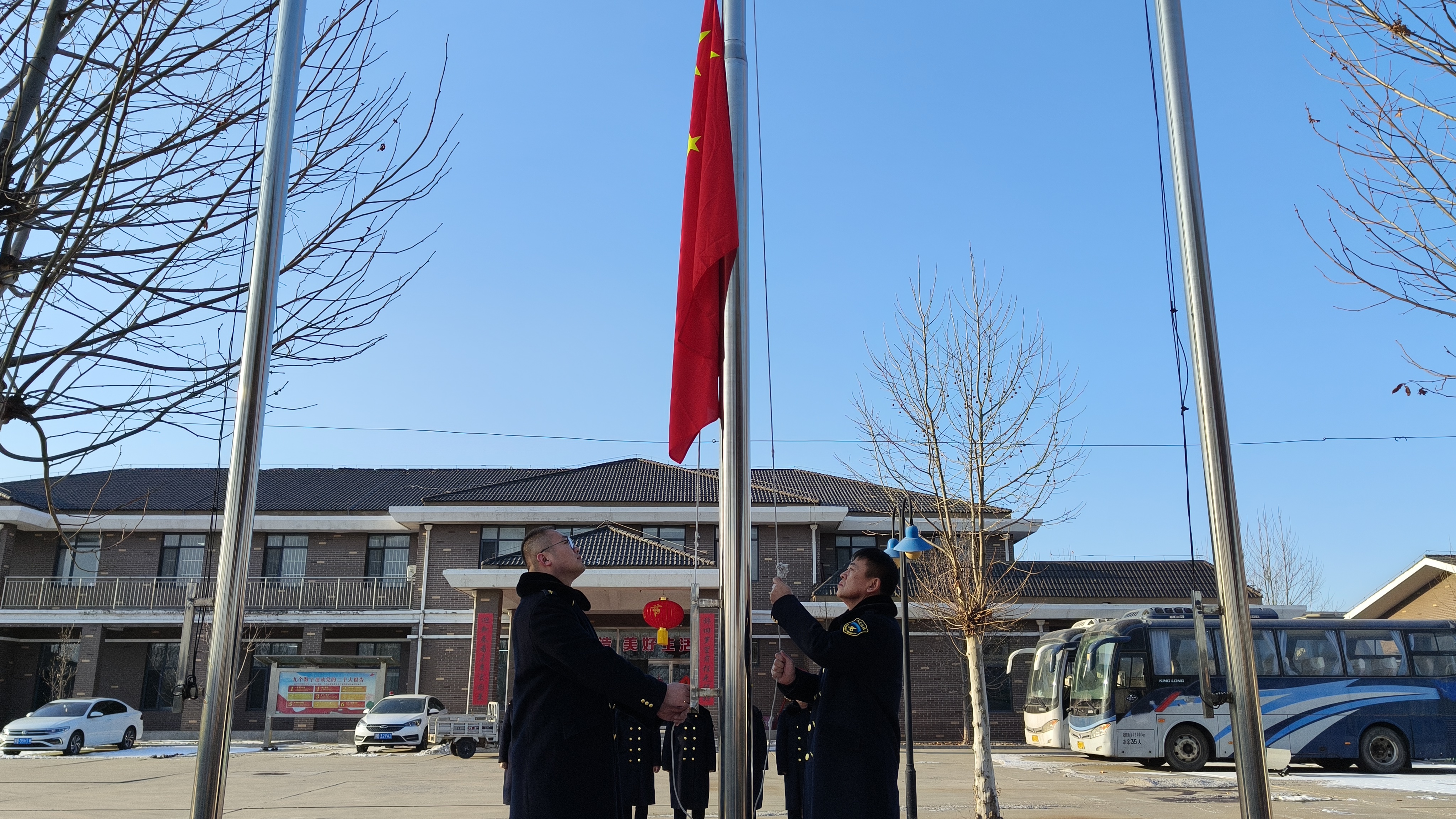 随着激昂雄壮的国歌声骤然响起,一面鲜艳的五星红旗在晨光中缓缓升起,宛如希望的灯塔,在众人饱含深情的目光中迎风招展,熠熠生辉。这一刻,在场的每一位职工心中都涌动着对伟大祖国的深切热爱与对美好未来的无限向往,他们的眼神坚定而炽热,共同见证了这一庄严而神圣的时刻。