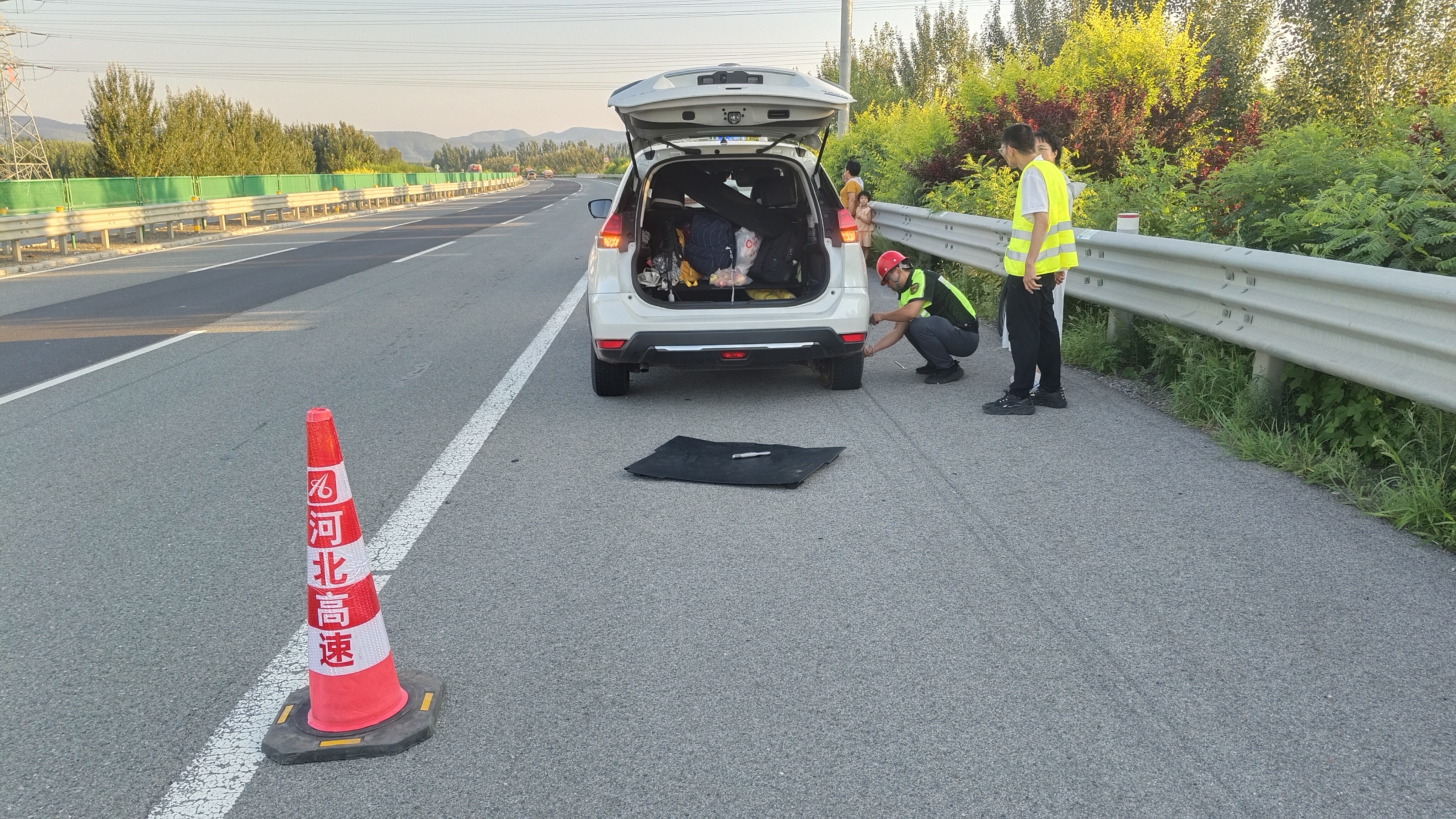 8月9日下午2时,指挥调度中心巡查人员驾驶巡查车辆行驶在京秦高速(G0121)北京方向K135附近时,发现一辆小轿车打着双闪灯停在应急车道上,司机在车旁焦急地打着电话,炎热的天气加上故障的困扰,让他显得十分无助。