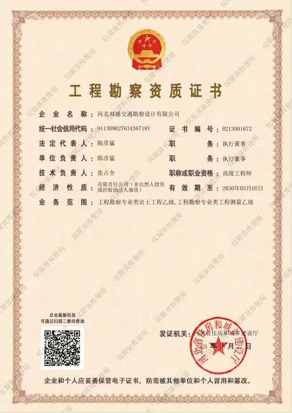 近日,经河北省住房和城乡建设厅核准,河北双盛交通勘察设计有限公司(以下简称“双盛公司”)成功取得“工程勘察专业类岩土工程乙级”资质。该资质的获批,是公司在专业资质体系建设中的重要突破,标志着双盛公司在岩土工程领域的专业能力与服务水准获得权威认可。